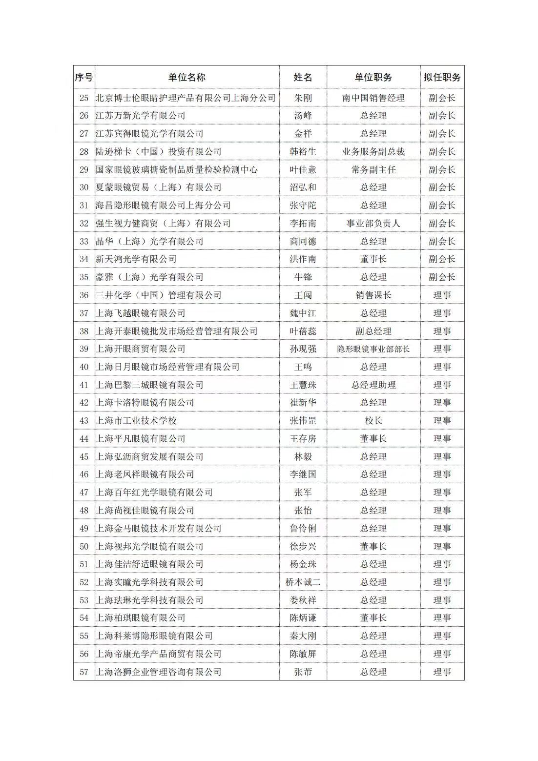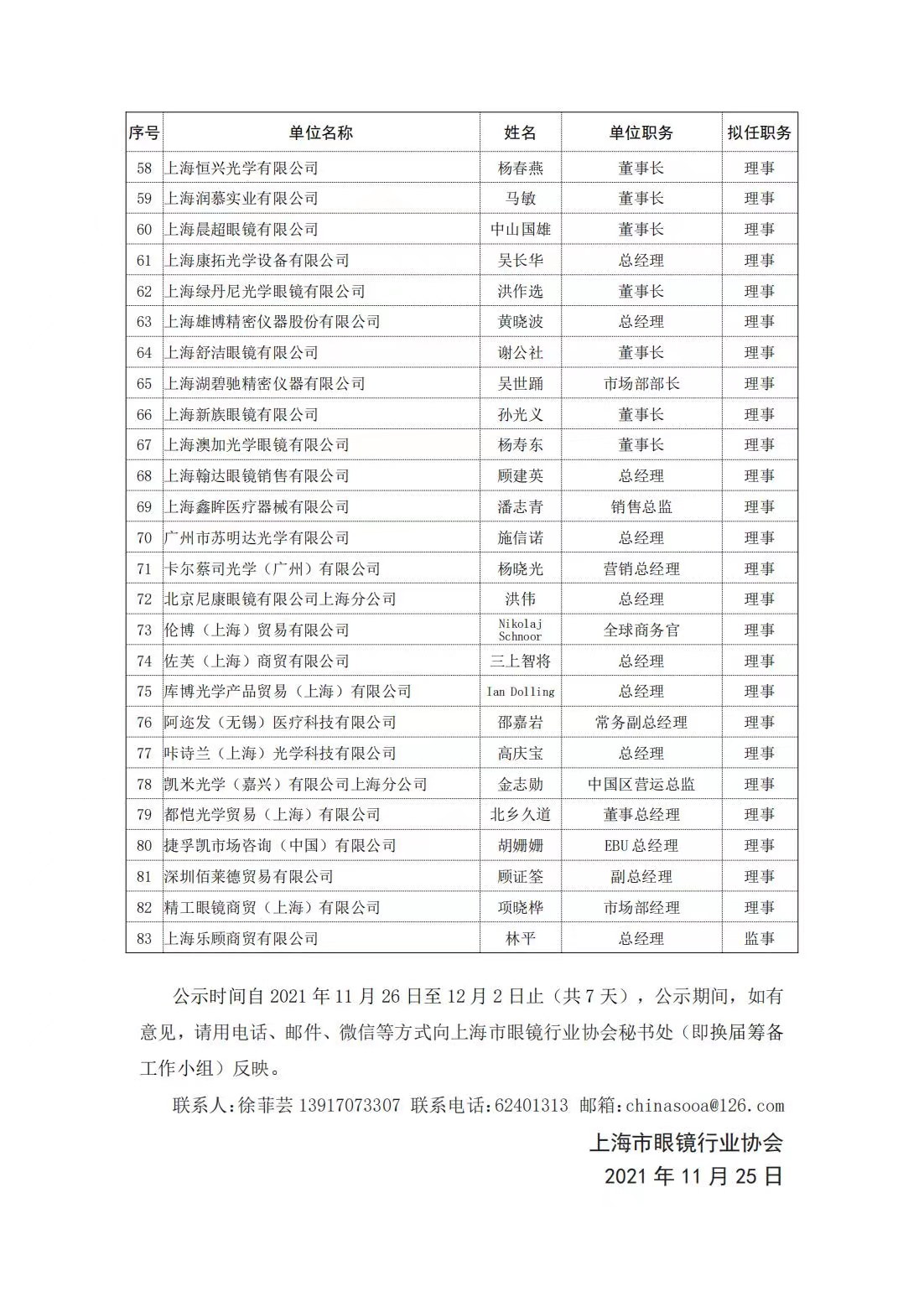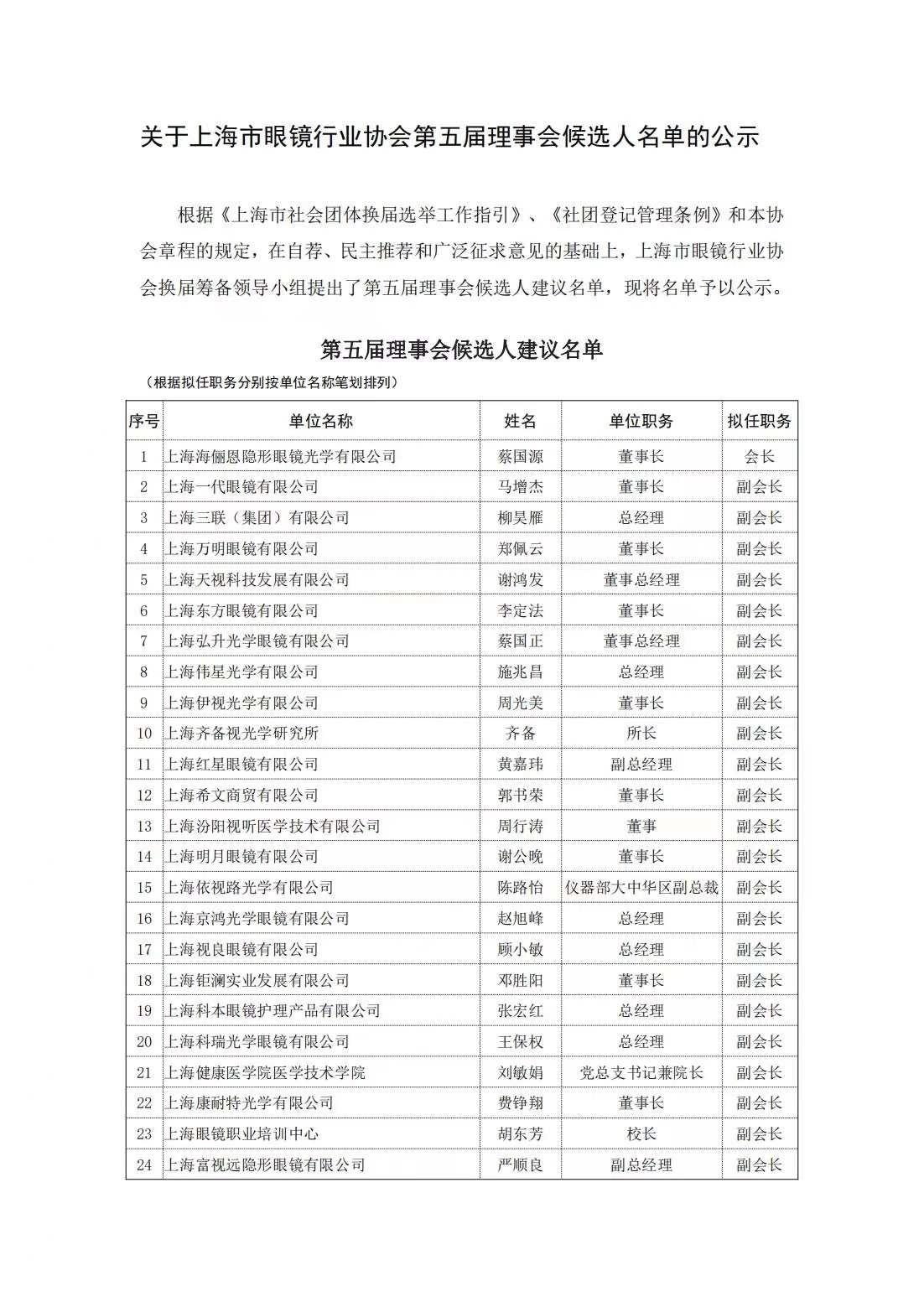 关于上海市眼镜行业协会第五届理事会候选人名单的公示