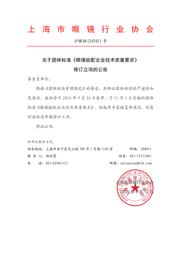 关于团体标准《眼镜验配企业技术质量要求》 修订立项的公告