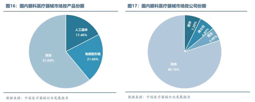 全球角度看,眼科医疗器械行业巨头优势明显,诺华(爱尔康)、依视路、强生(眼力健)三家龙头企业占据行业62.7%的市场份额,前十名市场份额合计达99%,寡头垄断明显,行业高度集中。 放眼国内,2017年《中国医疗器械行业发展报告》显示,由于屈光不正患病率和白内障手术率的提高,治疗这两类眼科疾病的的角膜接触镜和人工晶体在眼科医疗器械市场中占比较高,且预计未来仍将保持高增长态势;就公司而言,诺华、博士伦和强生分别以7.2%,6.8%,5.9%的市场份额排名前三;此外,雅培、拓普康、海昌、高视远望、六六视觉、卫康、欧普康视等占比较高,总体来看外资企业占据80%以上的市场份额,各级医疗机构的眼科医疗器械仍以进口为主,国产产品只有加强技术研发投入,才能获得更大的竞争优势。近年来,部分国产厂家正加大科研投入,加速进军中高端眼科医疗器械市场,在人工晶状体、角膜接触镜等领域都实现了重大突破。2014年,爱博诺德推出国内首款拥有自主知识产权、有高端屈光功能的可折叠人工晶状体,市占率达到10%,打破了国际厂商对高端人工晶状体技术和市场的垄断局面,在2019年爱博诺德又推出角膜塑形镜新产品。2016年9月,蕾明视康旗下产品蕾明RS系列非球面人工晶状体,获欧盟CE认证,2017年获CFDA批准。相较于同类进口产品,国产品牌具有明显价格竞争优势。