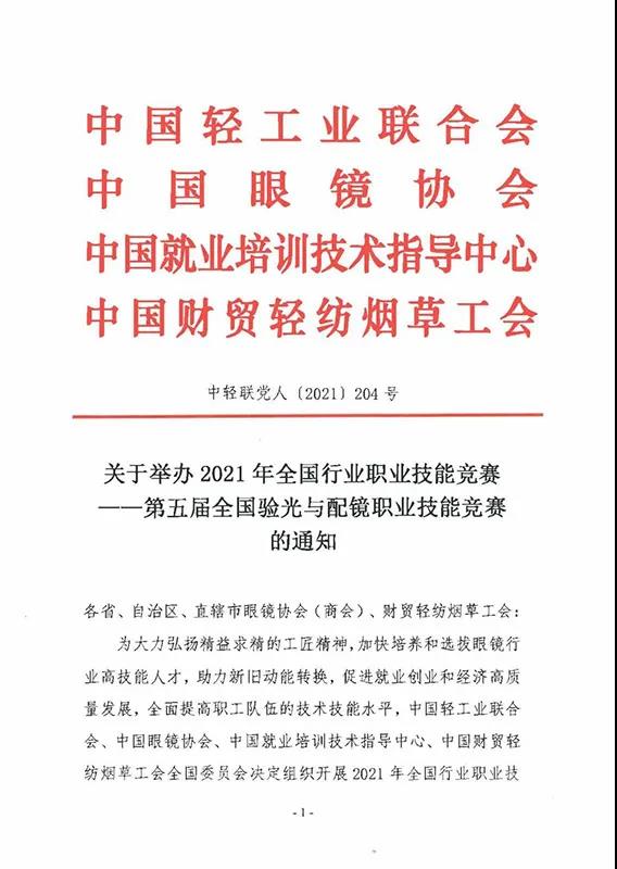 近日,中国轻工业联合会、中国眼镜协会、中国就业培训技术指导中心、中国财贸轻纺烟草工会联合下发《关于举办2021年全国行业职业技能竞赛——第五届全国验光与配镜职业技能竞赛的通知》(中轻联党人〔2021〕204号)并组建竞赛组织委员会,全面负责竞赛的整体安排和组织管理。