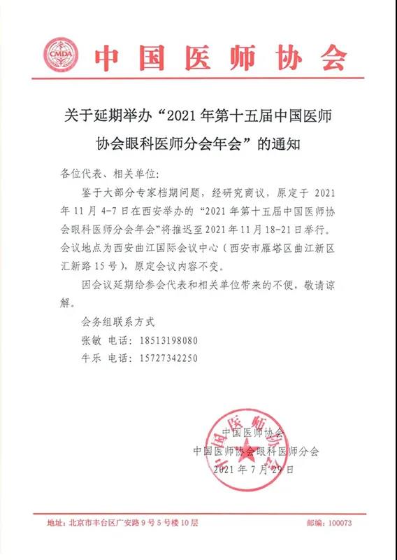 2021年第十五届中国医师协会眼科医师分会年会延期召开