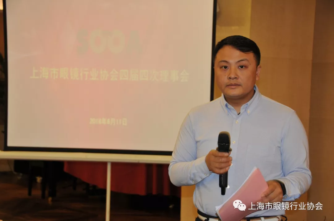 2018年6月11日,上海市眼镜行业协会假座市政协召开四届四次理事会,上海市消保委秘书长陶爱莲、上海市工商管理局广告监督管理处处长应钧、上海市眼镜行业协会会长蔡国源、秘书长胡东芳等领导,以及全体理事单位代表悉数参加本次会议。