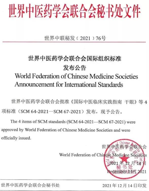 这是中医眼科历史上首次发布的中英文中医眼科国际标准, 为中医眼科走向世界产生了积极的推动作用。