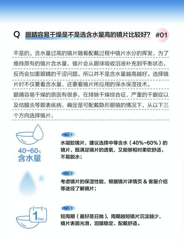 对此,《指南》给出了答案。选购隐形眼镜建议按透氧量、含水量、配戴周期、颜色、直径、基弧及品牌7大原则进行选购。比如在透氧量上,如果长期配戴低透氧量的镜片,容易造成角膜缺氧、水肿;在含水量上,并不是含量越高的隐形眼镜越好,选择镜片时还要同时看其应用的保水保湿技术,不然反而会加重眼睛的干涩等问题。