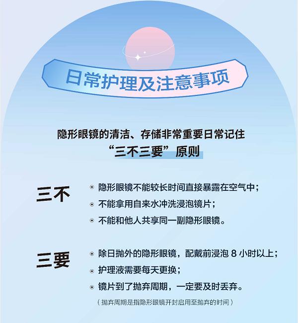 “三不”指隐形眼镜不能较长时间直接暴露在空气中;不能用自来水冲洗浸泡镜片;不能和他人共享同一副隐形眼镜;“三要”指除日抛外的隐形眼镜,配戴前浸泡8小时以上;护理液需要每天更换;镜片到了抛弃周期,一定要及时丢弃。