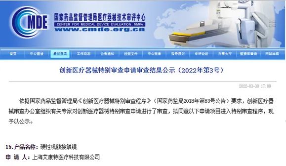近日,艾康特医疗科技的“VSL硬性巩膜接触镜”顺利通过国家药品监督管理局创新医疗器械特别审查程序,获得产品NMPA 认证优先办理权(创新审查受理号:CQTS2200065)。作为应用于不规则角膜诊疗的三类医疗器械,本次创新申请的通过,体现了VSL硬性巩膜接触镜的先进性以及优越的临床应用价值,将加速推动巩膜镜的临床应用,开启不规则角膜诊疗新时代!