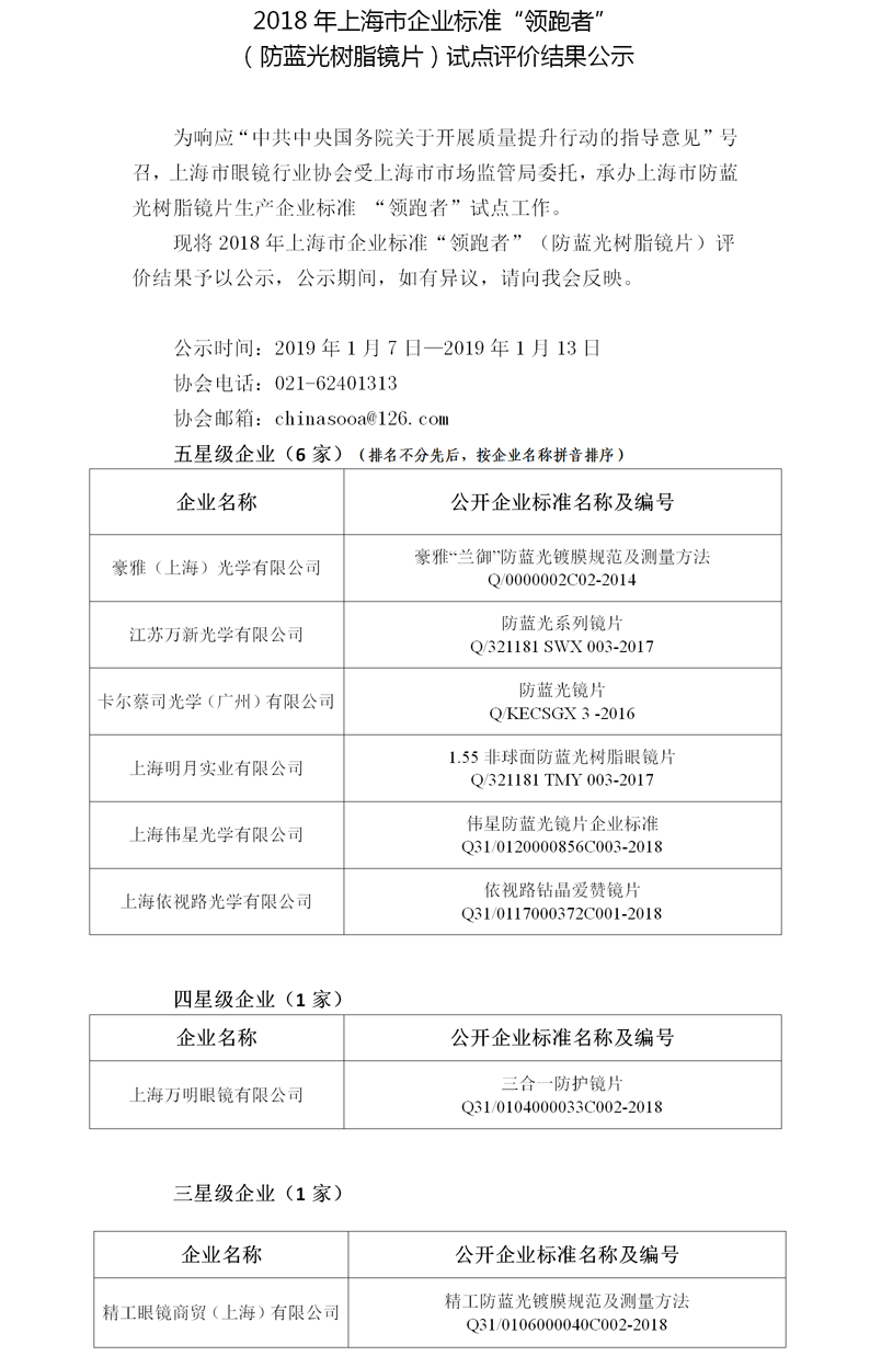 2018年上海市企业标准“领跑者”(防蓝光树脂镜片)试点评价结果公示