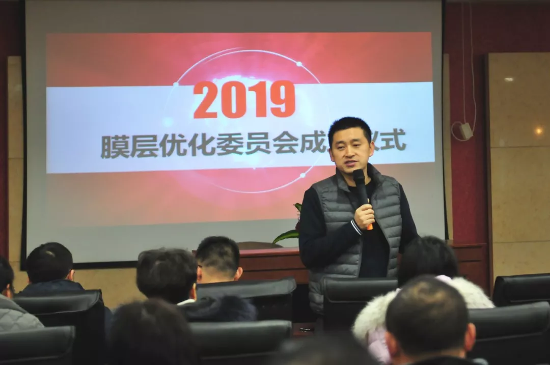 膜层优化委员会主席汤峰对执行主席王云、五位高级工程师、四位助理工程师以及四位支持专家颁发了聘书,执行主席王云代表膜层优化委员会发言。作为执行主席,他表示会不遗余力地投入到万新光学膜层优化升级中去,并且跟随汤总带领膜层优化委员会的成员一起努力实现2019年度目标。