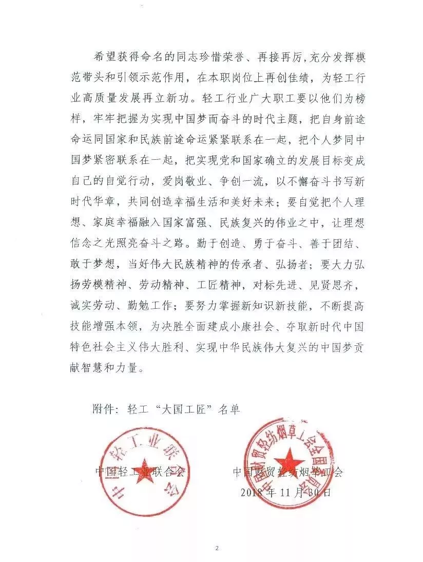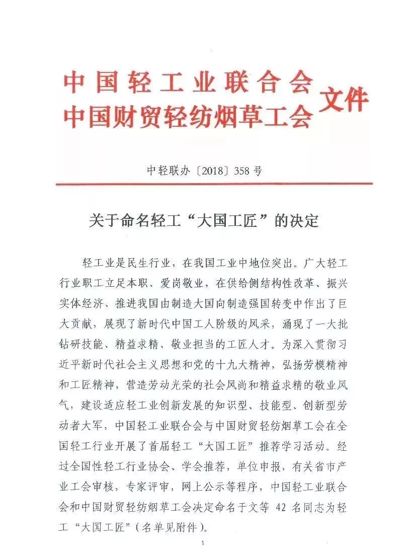 日前,中国轻工业联合会和中国财贸轻纺烟草工会联合下发关于命名轻工“大国工匠”决定的文件。经过全国性轻工行业协会、学会推荐,单位申报,有关省市产业工会审核,专家评审,网上公示等程序,共42名同志被命名为轻工“大国工匠”,上海三联(集团)有限公司蓝金康入选。