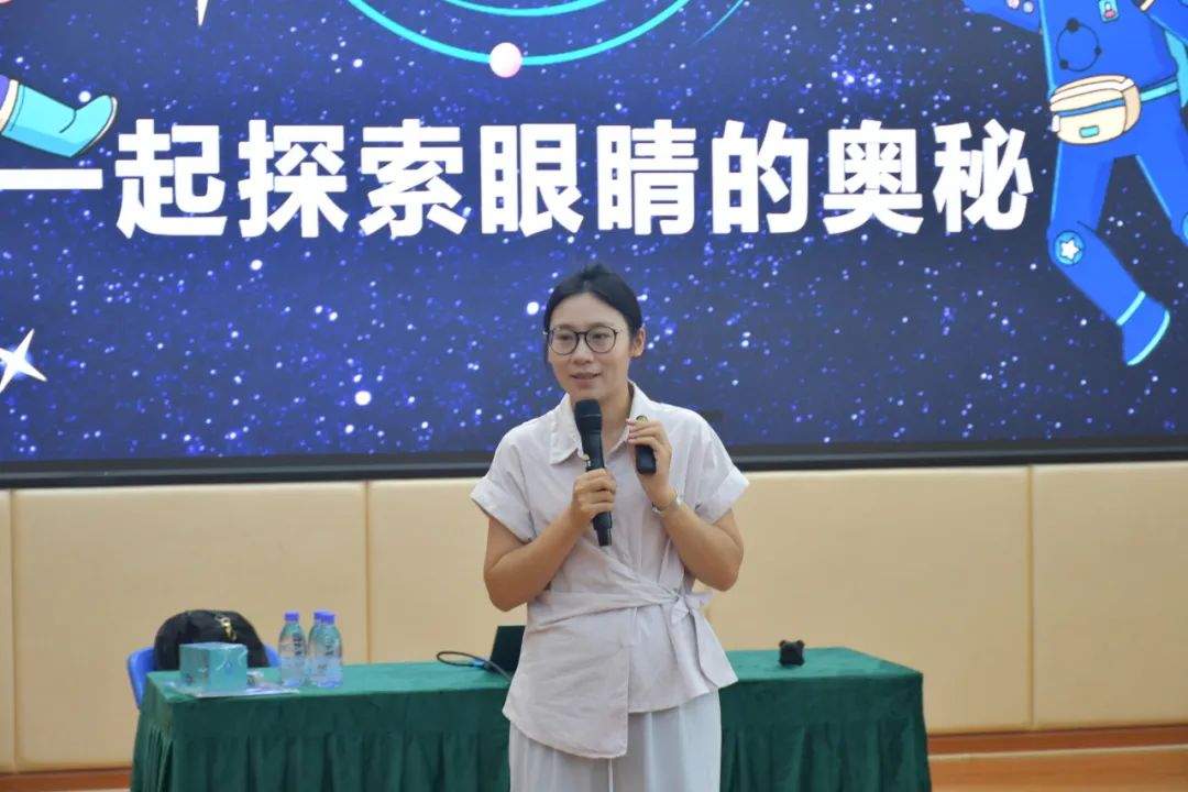 来自依视路公司的范玉兰培训讲师以 “视觉星球挑战” 为奇妙故事线,通过真实案例、趣味动画,把护眼知识讲得超级有趣!“视觉星球”的奇妙设定瞬间抓住了全场目光,线下线上的同学们跨越空间,一起化身“视觉星球探险家”。范老师详细介绍眼睛构造,就像揭秘视觉星球 “神秘基地” ,让同学们知道眼睛如何 “工作”,长时间看电子屏、读写姿势不对,就像往星球里丢 “垃圾” ,一步步让视力 “生病”,展示近视、散光等问题带来的 “麻烦” ,同学们听得认真,并牢牢记住护眼要点:读写要 “一拳一尺一寸” 、别总当 “电子屏宝宝” 、多去户外给眼睛 “放风” 。
