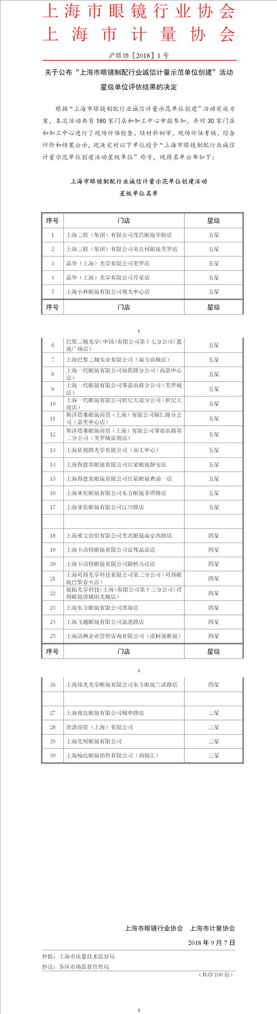 关于公布“上海市眼镜制配行业诚信计量示范单位创建”活动星级单位评估结果的决定